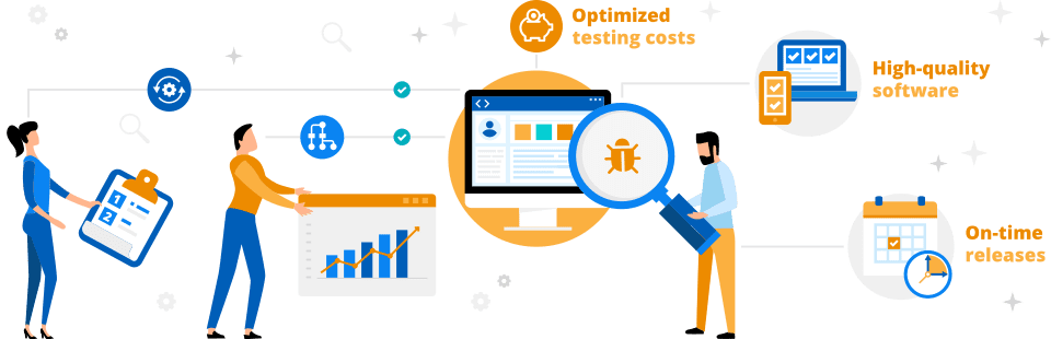 We tailor testing processes to the pace of your project whether it follows any of the Agile or the Waterfall methodology and set up testing processes for projects with CI/CD pipelines. We further improve testing velocity due to: